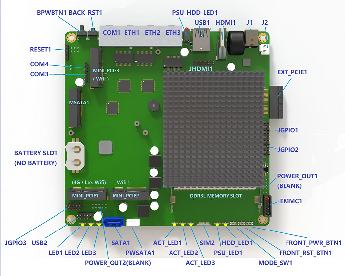 Expansion: 4 miniPCI express (1 4GLte/Wifi,2 Wifi, 1 mSATA), GPIO header, I2C bus, COM3/4 (TXD / RXD / GND)