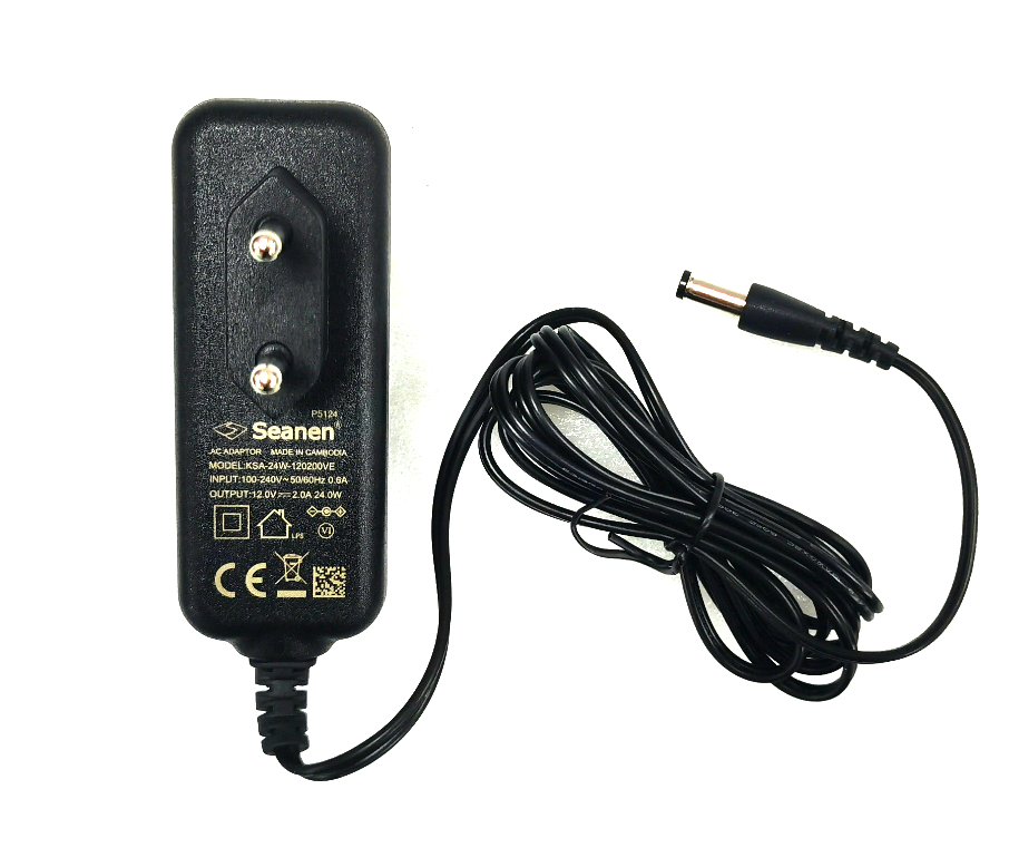 | Spec | Input voltage 100-240 V AC, 50/60 Hz. Output voltage 12 V DC. High efficiency. Jack inner diameter 2.5 mm, outer diameter 5.5 mm, center positive. |