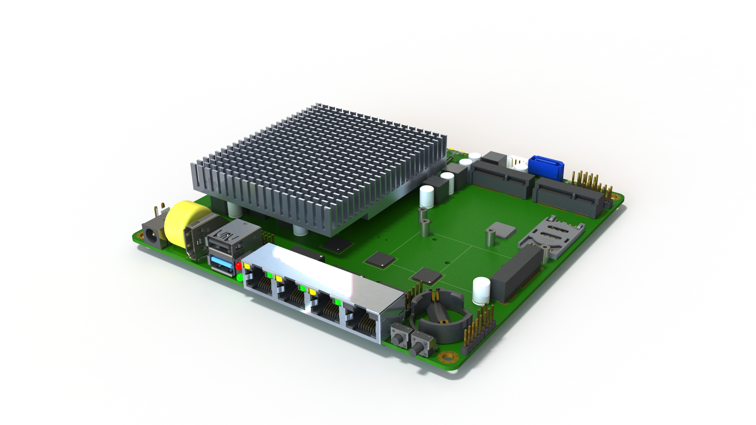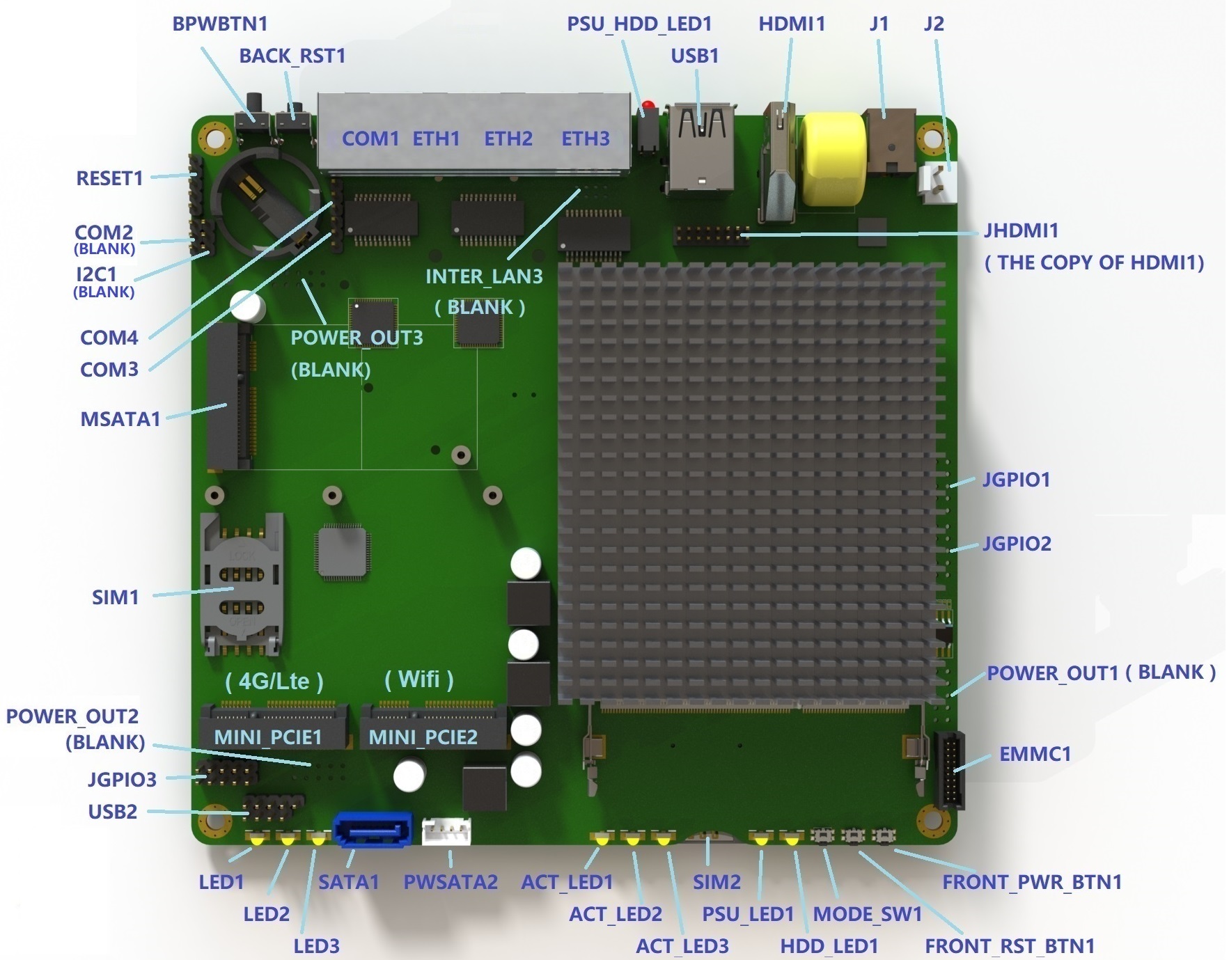 Expansion: 3 miniPCI express (one with SIM socket,1 Wifi,1 mSATA), GPIO header, I2C bus, COM3/4 (TXD / RXD / GND)